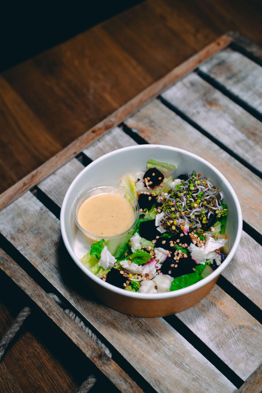Ingredients: Roman lettuce, beetroot, alfalfa sprouts, goat cheese, roast buckwheat, vinaigrette (olive oil, white wine vinegar,    Dijon mustard, honey, garlic, salt, pepper).